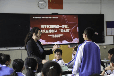 為深入貫徹習(xí)近平總書記在學(xué)校思想政治理論課教師座談會上的重要講話精神,全領(lǐng)域、全系統(tǒng)、全方位推進“膠州市新時代大中小學(xué)思政課一體化共同體”,6月5日,膠州市實驗初級中學(xué)與青島工學(xué)院舉辦交流活動。參加交流的有青島工學(xué)院馬克思主義學(xué)院副院長劉曉燕、教師代表,以及膠州市實驗初級中學(xué)副校長盧桂華、教導(dǎo)主任葉新春和學(xué)生們。
