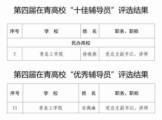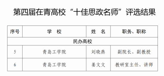 近日,中共青島市委教育工委公示了《第四屆在青高?!笆阉颊麕煛薄笆演o導員”評選結(jié)果》名單,我校馬克思主義學院劉曉燕老師和姜文文老師獲評在青高?!笆阉颊麕煛保庹Z學院徐曉燕老師獲評在青高?!笆演o導員”,建筑工程學院孫佩琳老師獲評“優(yōu)秀輔導員”榮譽稱號。
