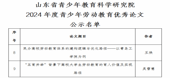 王煥老師報(bào)送的《民辦高校勞動(dòng)教育體系的建構(gòu)邏輯與優(yōu)化路徑——以青島工學(xué)院為例》、吳雪慧老師報(bào)送的《“五育并舉”背景下高校大學(xué)生勞動(dòng)教育的育人價(jià)值及實(shí)現(xiàn)路徑》榮獲2024年青少年勞動(dòng)教育優(yōu)秀論文。