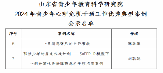 陳敏軍老師報(bào)送的《一條消息背后的生死營(yíng)救》、劉聰聰老師報(bào)送的《孤獨(dú)少年的屠龍作戰(zhàn)計(jì)劃——SAFER-R模型下一例分離身份障礙危機(jī)干預(yù)應(yīng)用案例》榮獲2024年青少年心理危機(jī)干預(yù)工作優(yōu)秀典型案例。
