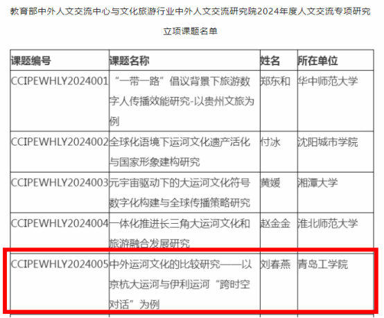 近日,教育部中外人文交流中心、文化旅游行業(yè)中外人文交流研究院公布了2024年度人文交流專項(xiàng)研究課題立項(xiàng)結(jié)果,我校馬克思主義學(xué)院劉春燕老師申報(bào)的《中外運(yùn)河文化的比較研究——以京杭大運(yùn)河與伊利運(yùn)河“跨時(shí)空對(duì)話”為例》成功立項(xiàng)。