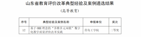 近日,山東省教育科學(xué)研究院發(fā)布了2024年度教育改革典型經(jīng)驗及案例遴選結(jié)果,遴選出高等教育案例一等獎4項,二等獎8項。學(xué)校報送的《基于OBE理念的“多維多元雙聯(lián)”數(shù)字化教學(xué)質(zhì)量評價改革實踐》成功入選,獲高等教育組二等獎。