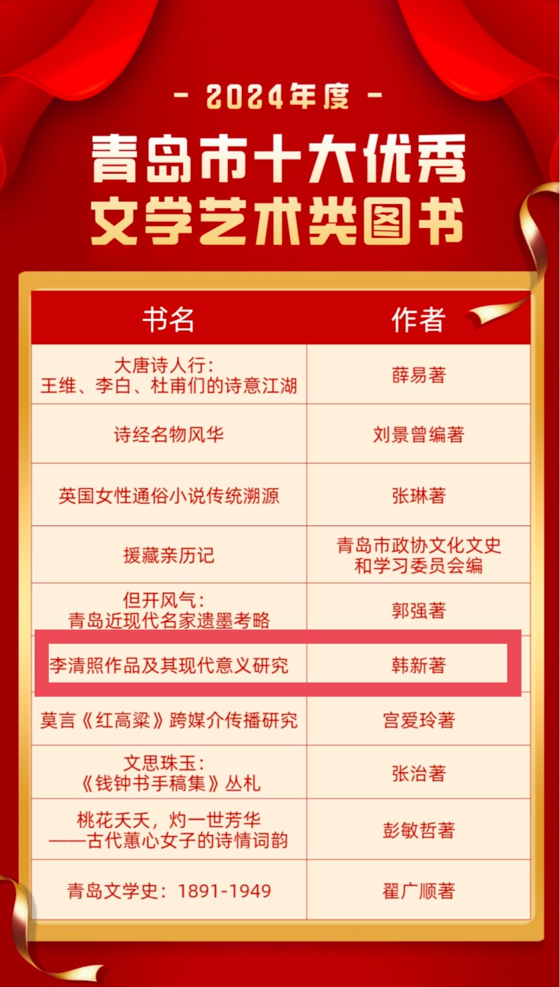 圖為青島市十大優(yōu)秀文學藝術類圖書榜單