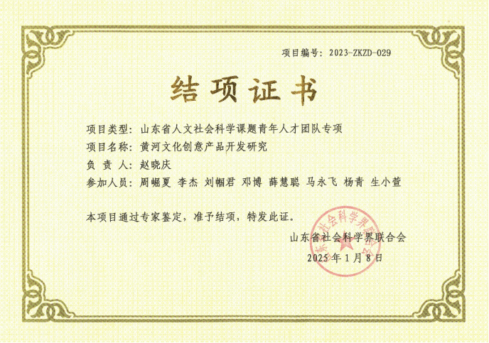 該項目的順利完成離不開課題組的協(xié)同攻關和依托單位的統(tǒng)籌協(xié)調。青島工學院作為依托單位,高度重視服務國家重大戰(zhàn)略,組建了涵蓋設計學、中國語言文學、社會學的跨學科交叉研究團隊?!包S河文化是中華民族的精神命脈,希望通過該課題的深入研究,為新時代黃河流域生態(tài)保護和高質量發(fā)展貢獻學校的力量?!毙iL劉連新表示。課題負責人趙曉慶教授帶領周崛夏、李杰、劉幗君、鄧博、薛慧聰、馬永飛、楊青、生小萱通力合作,發(fā)揮各自專業(yè)特長,展現(xiàn)出高度凝聚力和“青工”精神,保障了課題高質量如期完成。