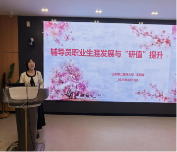 培訓以《輔導員職業(yè)生涯發(fā)展與“研值”提升》為主題,聚焦輔導員職業(yè)發(fā)展路徑與科研能力提升兩大核心議題。王郭婷主任立足其從“一線輔導員”到“學者型學工干部”的成長經(jīng)歷,系統(tǒng)分享了“理論-實踐-創(chuàng)新”融合發(fā)展的職業(yè)成長模式。作為浙江大學農(nóng)學博士、馬克思主義學院訪問學者,王主任結(jié)合主持教育部人文社科青年基金等5項省部級課題的科研實踐,重點解析了“研究四問”方法論,強調(diào)從問題導向、實際需求、科學路徑和前期基礎(chǔ)四個維度構(gòu)建科研體系。在職業(yè)發(fā)展方面,創(chuàng)新提出“五維工作法”,通過情感投入、格局培養(yǎng)、行動落實、創(chuàng)新思維和方法優(yōu)化五個層面破解職業(yè)發(fā)展瓶頸。