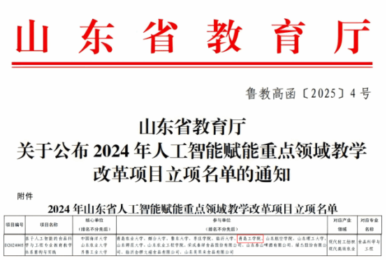 近日,山東省教育廳公布了2024年人工智能賦能重點領域教學改革“111計劃”項目立項名單。青島工學院作為參與單位,成功獲批“基于人工智能的食品科學與工程專業(yè)教育教學體系重構與實踐(項目編號:D2024005)”項目,本項目具體由食品工程學院參與完成。這一成果標志著學院在探索人工智能與教育教學深度融合、提升專業(yè)建設水平方面取得了重要突破。