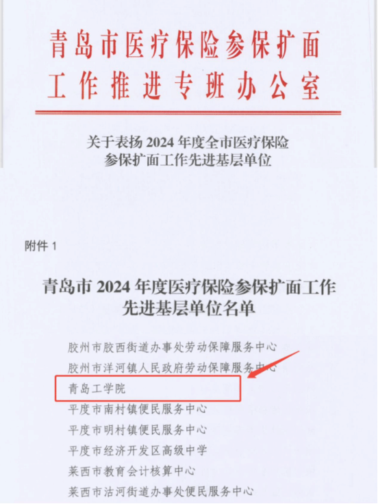 近日,青島市醫(yī)療保險參保擴面工作推進專班辦公室發(fā)布《關于表揚2024年度全市醫(yī)療保險參保擴面工作先進基層單位和先進個人的通報》,青島工學院獲評“青島市2024年度醫(yī)療保險參保擴面工作先進基層單位”。