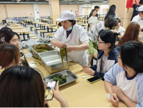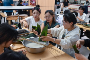 實(shí)踐環(huán)節(jié)采用“15人小組制”,在食堂師傅“一對一”指導(dǎo)下,師生協(xié)同完成折葉、填米、捆扎全流程。食品工程學(xué)院團(tuán)隊(duì)?wèi){借專業(yè)優(yōu)勢,包制的粽子形態(tài)標(biāo)準(zhǔn)、捆扎牢固,榮獲“最佳團(tuán)隊(duì)”稱號(hào)?;顒?dòng)現(xiàn)場粽葉清香與歡聲笑語交織,展現(xiàn)了傳統(tǒng)文化與現(xiàn)代教育的有機(jī)融合。