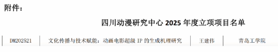 近日,青島工學(xué)院王建偉副教授申報的四川省哲學(xué)社會科學(xué)重點研究基地四川動漫研究中心2025年度課題《文化傳播與技術(shù)賦能:動畫電影超級IP的生成機理研究》成功獲批立項。該課題的獲批,標(biāo)志著學(xué)校在文化創(chuàng)意與數(shù)字技術(shù)融合領(lǐng)域持續(xù)深耕,積極搶占文化科技創(chuàng)新制高點、服務(wù)國家和文化產(chǎn)業(yè)高質(zhì)量發(fā)展的又一重要突破,充分彰顯了青島工學(xué)院在新文科建設(shè)領(lǐng)域的學(xué)科優(yōu)勢與科研擔(dān)當(dāng)。