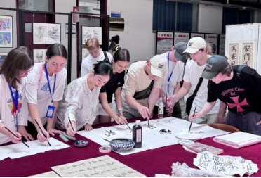 輕松愉快的“你劃我猜”雙語(yǔ)游戲環(huán)節(jié),圍繞中俄文化符號(hào)展開。兩國(guó)學(xué)生通過生動(dòng)的肢體語(yǔ)言和雙語(yǔ)交流,在歡聲笑語(yǔ)中迅速拉近了彼此的距離,現(xiàn)場(chǎng)氣氛熱烈融洽?;顒?dòng)還安排了校園書法展參觀環(huán)節(jié),中俄師生共同欣賞了筆走龍蛇的書法作品,領(lǐng)略中國(guó)書法的獨(dú)特神韻。在書法體驗(yàn)區(qū),俄羅斯學(xué)生們興致勃勃地嘗試揮毫潑墨,親身感受漢字藝術(shù)的魅力。