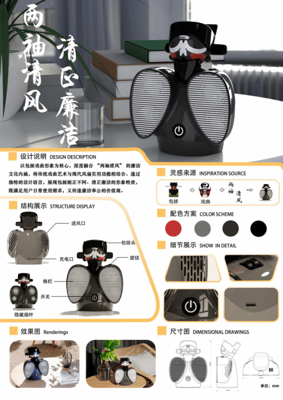 本屆大賽由中國(guó)紀(jì)檢監(jiān)察雜志社、山東省紀(jì)委監(jiān)委、山東省文學(xué)藝術(shù)界聯(lián)合會(huì)、濟(jì)南市紀(jì)委監(jiān)委聯(lián)合主辦,以“岱青海藍(lán)·廉鑄初心”為主題,吸引了全國(guó)30個(gè)?。▍^(qū)、市)39384部作品參賽。經(jīng)過初評(píng)、復(fù)評(píng)和終評(píng)三輪嚴(yán)格遴選,最終僅有338部作品入圍,競(jìng)爭(zhēng)異常激烈。我校獲獎(jiǎng)作品《兩袖清風(fēng) 清正廉潔》以包拯戲曲形象為核心,巧妙融合“兩袖清風(fēng)”的廉潔寓意,將中華優(yōu)秀傳統(tǒng)戲曲藝術(shù)與現(xiàn)代日用產(chǎn)品有機(jī)結(jié)合,兼具廉潔文化與實(shí)用功能。作者通過扎實(shí)的專業(yè)能力和獨(dú)特的設(shè)計(jì)語言,生動(dòng)展現(xiàn)了包拯剛正不阿、清正廉潔的精神風(fēng)貌,推動(dòng)廉潔理念走進(jìn)千家萬戶。
