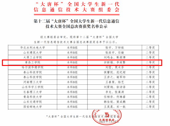 第十二屆“大唐杯”全國(guó)總決賽吸引了全國(guó)數(shù)百所高校的數(shù)千支隊(duì)伍參賽,競(jìng)爭(zhēng)異常激烈。田新強(qiáng)與李政繁同學(xué)的獲獎(jiǎng),展現(xiàn)了青島工學(xué)院學(xué)子在新一代信息通信技術(shù)領(lǐng)域的潛力與風(fēng)采,也為學(xué)校在相關(guān)專(zhuān)業(yè)建設(shè)和人才培養(yǎng)方面積累了寶貴經(jīng)驗(yàn)。