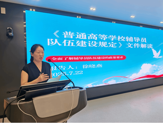 在專題解讀環(huán)節(jié),外語學(xué)院黨總支副書記徐曉燕對《普通高等學(xué)校輔導(dǎo)員隊伍建設(shè)規(guī)定》進(jìn)行了深入剖析。她重點圍繞思想理論教育和價值引領(lǐng)、黨團(tuán)和班級建設(shè)、學(xué)風(fēng)建設(shè)、心理健康教育與咨詢、網(wǎng)絡(luò)思想政治教育、校園危機(jī)時機(jī)應(yīng)對等核心領(lǐng)域,結(jié)合學(xué)生工作實際案例,闡述了輔導(dǎo)員如何以黨的最新理論成果為指引,創(chuàng)新育人方式。她強(qiáng)調(diào):“輔導(dǎo)員需緊跟時代步伐,通過多元化手段將正確價值觀融入學(xué)生日常學(xué)習(xí)與生活,引導(dǎo)學(xué)生筑牢理想信念之基?!?/p>