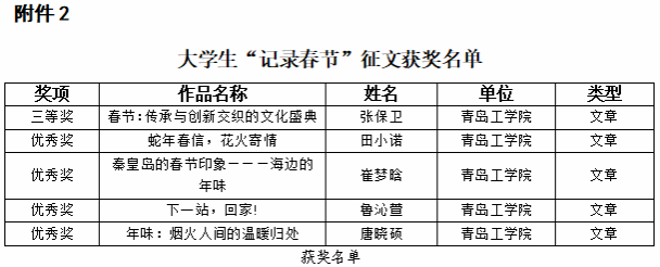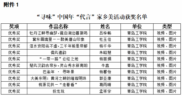 近日,山東省社會科學(xué)界聯(lián)合會下發(fā)了《關(guān)于“尋味中國年”大學(xué)生作品征集競賽獲獎情況的通報》,青島工學(xué)院在此次競賽中成績斐然,共榮獲1個三等獎、14個優(yōu)秀獎。