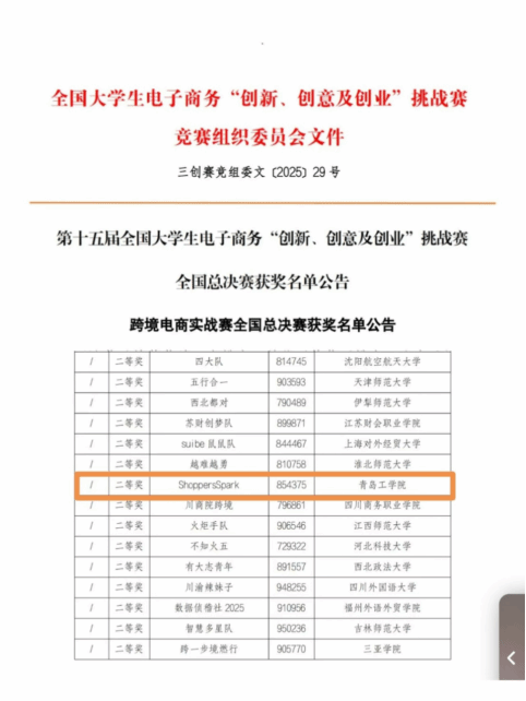 近日,第十五屆全國大學(xué)生電子商務(wù)“創(chuàng)新、創(chuàng)意及創(chuàng)業(yè)”挑戰(zhàn)賽(以下簡稱“三創(chuàng)賽”)全國總決賽圓滿落幕。青島工學(xué)院外語學(xué)院ShopperSpark團隊憑借出色的跨境電商實戰(zhàn)項目,榮獲全國二等獎,充分展示了學(xué)校在跨學(xué)科復(fù)合型人才培養(yǎng)方面的扎實成效。