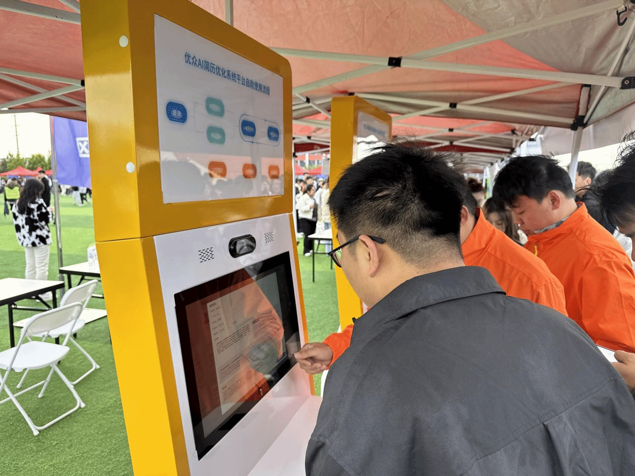 (工作人員指導(dǎo)學(xué)生使用AI簡(jiǎn)歷優(yōu)化系統(tǒng))
