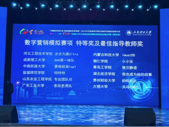 2025年10月17日—19日,第十二屆“學(xué)創(chuàng)杯”全國(guó)大學(xué)生創(chuàng)業(yè)綜合模擬演訓(xùn)活動(dòng)全國(guó)總決賽(高教組)在成都理工大學(xué)落下帷幕。經(jīng)過激烈角逐,我校經(jīng)濟(jì)管理學(xué)院宮楚鈺(2021級(jí)審計(jì)學(xué))、金秋全(2022級(jí)財(cái)務(wù)管理)、林晨陽(2023級(jí)審計(jì)學(xué))3位同學(xué)組成的楚蘭靜語代表隊(duì)進(jìn)入總決賽,并最終獲得數(shù)字營(yíng)銷模擬賽項(xiàng)特等獎(jiǎng),指導(dǎo)教師張思海、李光琴榮獲“最佳指導(dǎo)教師”稱號(hào),這是我校在該賽項(xiàng)上取得的歷史性突破!
