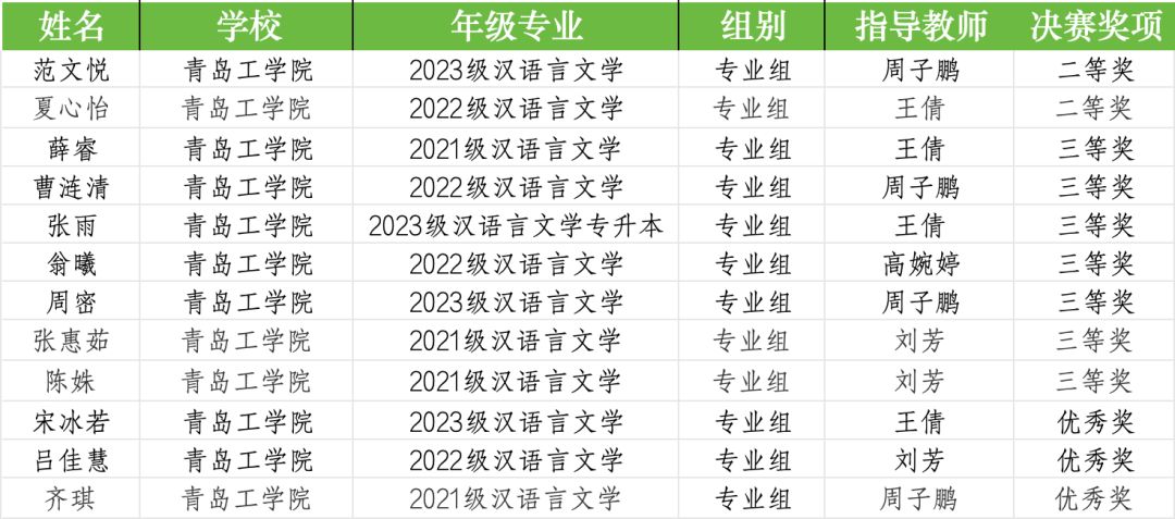 其中2023級漢語言文學(xué)的范文悅、2022級漢語言文學(xué)的夏心怡同學(xué)獲全國二等獎(jiǎng),薛睿、曹漣清、張雨、翁曦、周密、張惠茹、陳姝7位同學(xué)獲全國三等獎(jiǎng),宋冰若、呂佳慧、齊琪3位同學(xué)獲優(yōu)秀獎(jiǎng)。