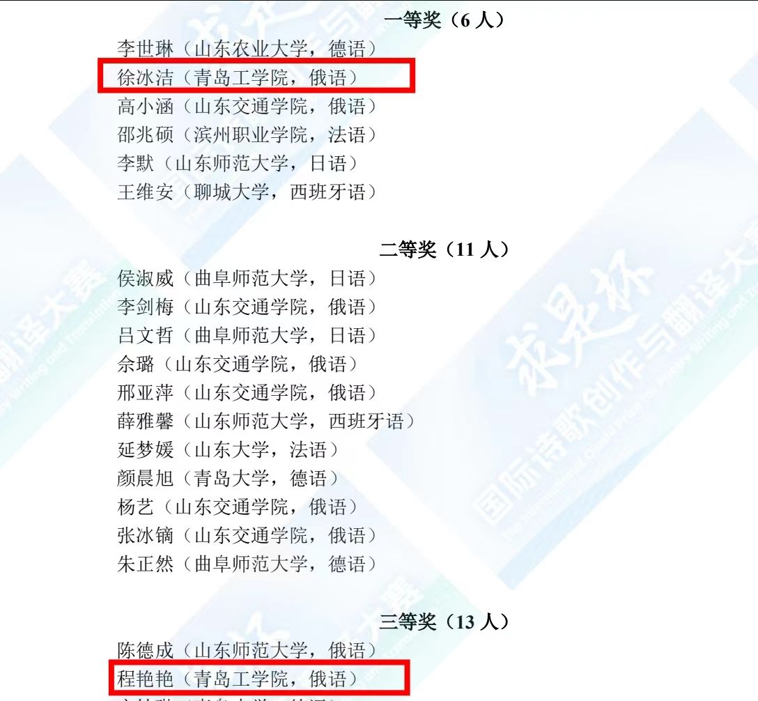 近日,備受矚目的第六屆"求是杯"國(guó)際詩(shī)歌創(chuàng)作與翻譯大賽省賽評(píng)審結(jié)果正式公布,外語(yǔ)學(xué)院俄語(yǔ)專(zhuān)業(yè)學(xué)生在這場(chǎng)文化盛宴中表現(xiàn)突出,喜獲佳績(jī)。2023級(jí)俄語(yǔ)一班徐冰潔獲得山東省(俄語(yǔ)組)一等獎(jiǎng),2023級(jí)俄語(yǔ)一班程艷艷獲得山東省(俄語(yǔ)組)三等獎(jiǎng)。其中,2023級(jí)俄語(yǔ)一班徐冰潔成功進(jìn)入國(guó)賽。