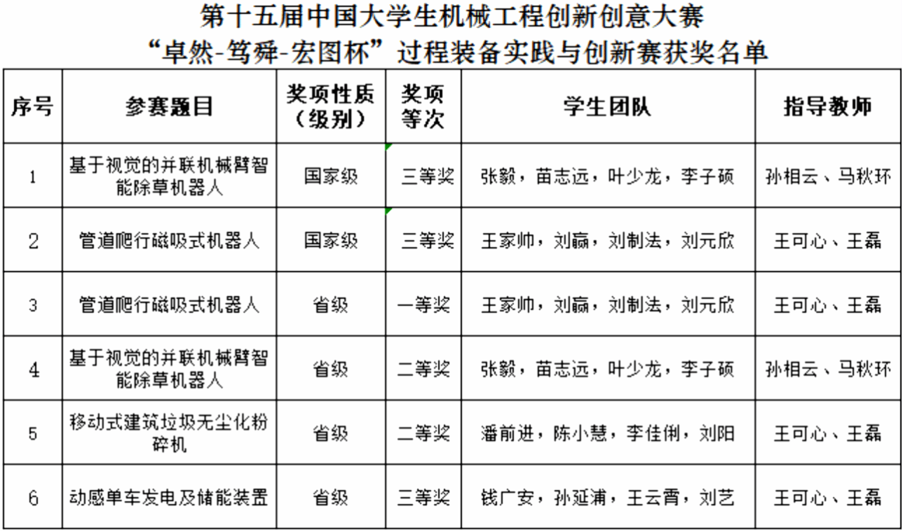 近日,第十五屆中國(guó)大學(xué)生機(jī)械工程創(chuàng)新創(chuàng)意大賽“卓然-篤舜-宏圖杯”過程裝備實(shí)踐與創(chuàng)新賽全國(guó)總決賽落下帷幕。本次大賽吸引了來自全國(guó)各地171所高校的2965個(gè)團(tuán)隊(duì)參賽,我院學(xué)子在大賽中再創(chuàng)佳績(jī),其中全國(guó)決賽入圍作品3項(xiàng),最終榮獲全國(guó)三等獎(jiǎng)2項(xiàng),此外在山東賽區(qū)榮獲一等獎(jiǎng)1項(xiàng)、二等距2項(xiàng)、三等獎(jiǎng)1項(xiàng)。
