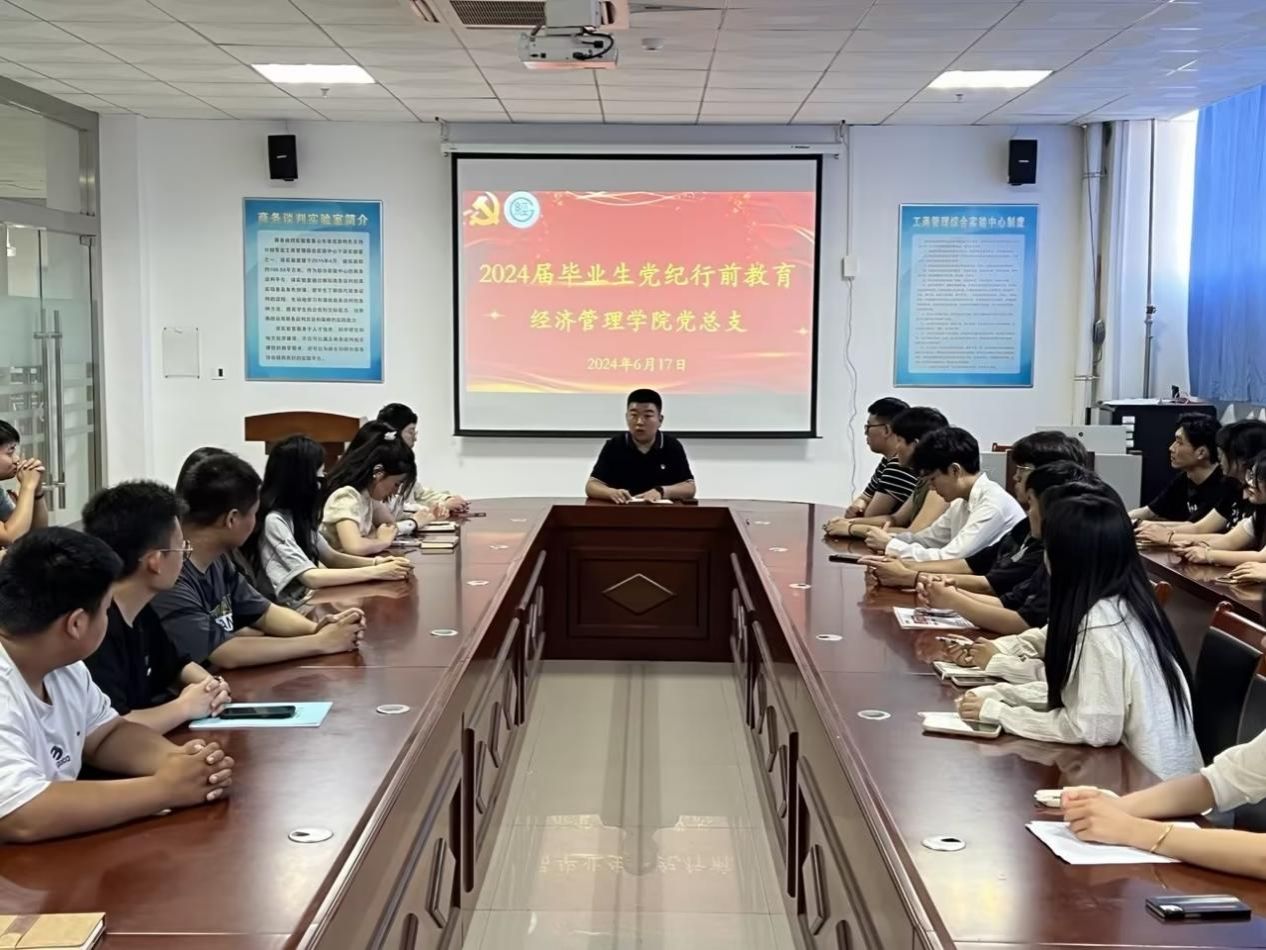 為進(jìn)一步貫徹落實(shí)黨紀(jì)學(xué)習(xí)教育有關(guān)工作要求,筑牢畢業(yè)生思想防線,增強(qiáng)紀(jì)律意識和廉潔意識,強(qiáng)化紀(jì)律建設(shè)和作風(fēng)建設(shè)。6月17日,經(jīng)濟(jì)管理學(xué)院黨總支在圖書館TG5006會議室開展2024屆畢業(yè)生行前教育活動,經(jīng)濟(jì)管理學(xué)院黨總支宣傳委員、團(tuán)總支書記、學(xué)生第一黨支部書記狄繼承出席本次活動,2024屆畢業(yè)生輔導(dǎo)員、全體畢業(yè)生黨員參加此次活動。