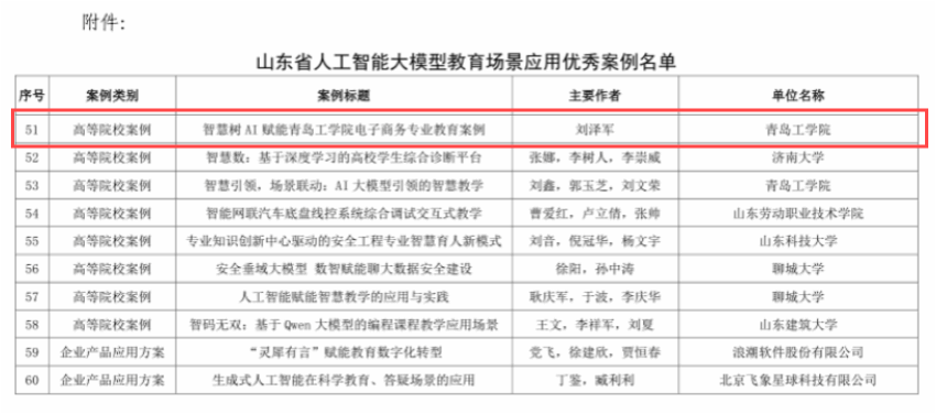 近日,山東省電化教育館公布《山東省人工智能大模型教育場景應(yīng)用優(yōu)秀案例名單》,我院劉澤軍老師申報的《智慧樹 AI 賦能青島工學(xué)院電子商務(wù)專業(yè)教育案例》獲批優(yōu)秀案例。