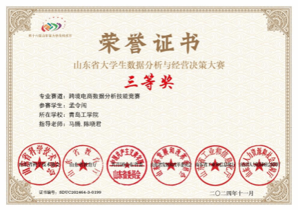 近日,山東省大學(xué)生數(shù)據(jù)分析與經(jīng)營決策大賽山東總決賽圓滿落幕,經(jīng)濟(jì)管理學(xué)院派出6名同學(xué)在陳曉君和馬騰老師的指導(dǎo)下,勇闖難關(guān),脫穎而出,榮獲5個(gè)省級三等獎(jiǎng)。