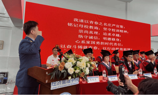 在馬克思主義學(xué)院優(yōu)秀畢業(yè)生郭鵬鵬的帶領(lǐng)下,全體畢業(yè)生高舉右拳,莊嚴(yán)宣誓:“銘記母校教誨,堅(jiān)守校訓(xùn)精神;崇尚真理,追求卓越;恪守誠信,明德修身;心系家國勇?lián)鷷r(shí)代責(zé)任;以奮斗鑄就青春,以行動(dòng)報(bào)效祖國!”鏗鏘誓言回蕩大廳,彰顯了新時(shí)代青年的責(zé)任與抱負(fù)。