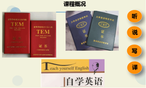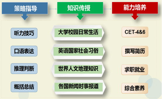 課程涉及學(xué)生校內(nèi)外的日常生活、英語國家的社會習(xí)俗、世界各地的人文地理知識和有關(guān)政治、經(jīng)濟(jì)、文化、體育等的新聞時事報(bào)道等,旨在提高學(xué)生的聽力水平、口語表達(dá)、判斷推理、概括總結(jié)、撰寫英文簡歷等能力,有助于學(xué)生備考大學(xué)英語四六級考試、求職就業(yè)及聽說交際能力的培養(yǎng)。